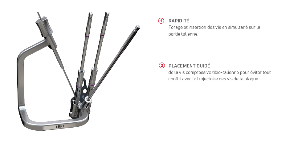 Adapté aux plaques antérieures mini et médium, le bloc viseur quick-drill simplifie les étapes de préparation des logements, d’insertion des vis taliennes et guide l’insertion de la vis compressive.